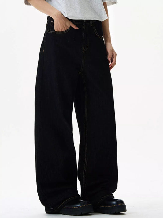 Stripe Button Pleated Drawstring Waist Casual Wide Leg Jeans
