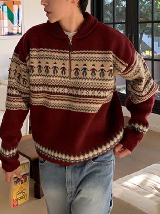Men's Retro Pattern Zip Front Knitted Sweater